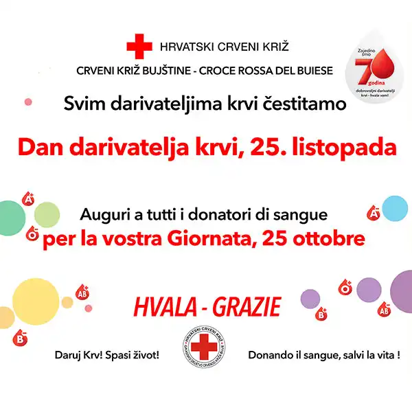 Objavljuje se priopćenje Hrvatskog crvenog križa Bujštine vezano za obilježavanje Dana darivatelja krvi i 70. obljetnice darivanja krvi u Republici Hrvatskoj.